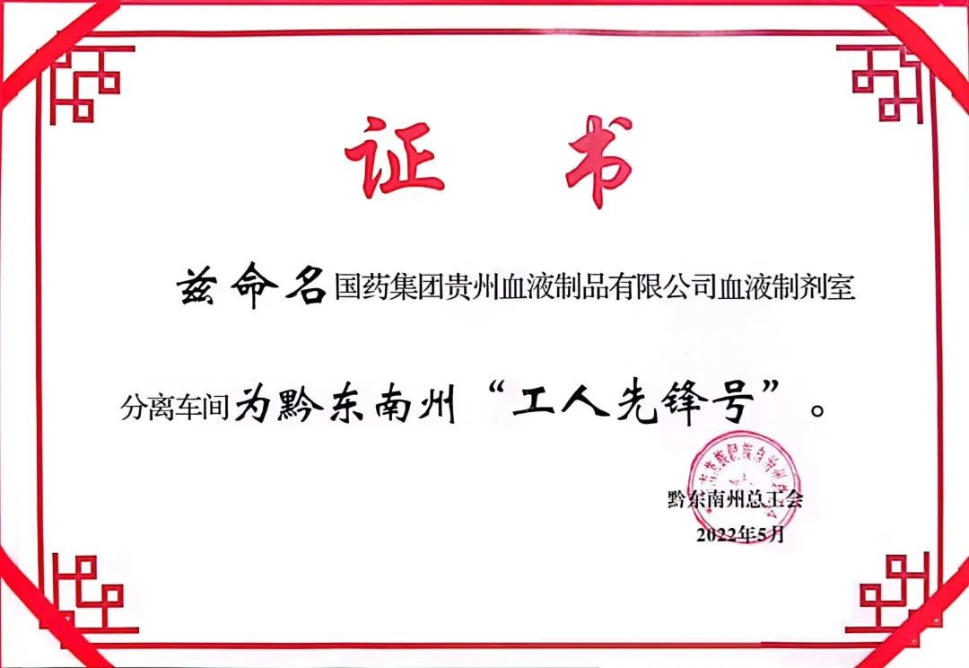 6月7日,貴州血制分離車(chē)間被黔東南州總工會(huì )授予“黔東南州工人先鋒號”榮譽(yù)稱(chēng)號。