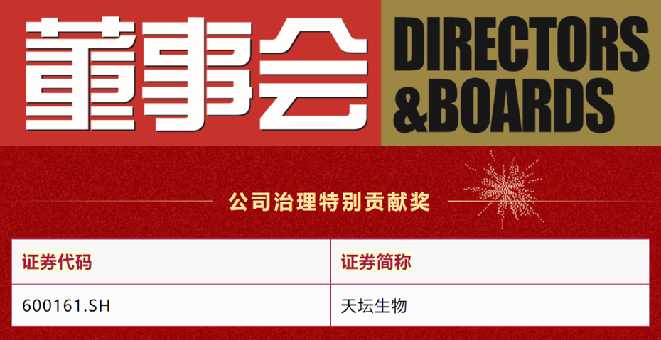 近日,第十八屆中國上市公司董事會(huì )“金圓桌獎”評選結果正式揭曉,天壇生物榮獲“公司治理特別貢獻獎”。
